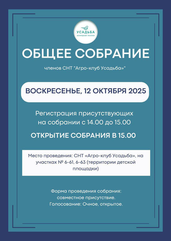 Общее собрание членов ДНП "Агро-клуб Усадьба»" в очной форме состоится 12 октября 2024 года.